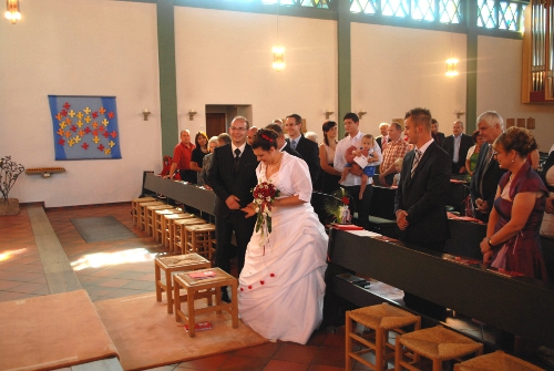 Die Brautjungfer ist reingelaufen und dem Organisten wurde das Zeichen zum Spielen gegeben und er fing an. Ich hatte dem Organisten freie Wahl beim Ein- und Auszugslieg gegeben. Er hat zum Einzug Jeremiah Clarke (1674 - 1707): "Prince of Denmark's March" gewählt. Was sehr schön war. Ich bin mit meinem Vater eingezogen. Alle meinen, wir wären zu schnell gewesen. Doch ich fand, wir sind schon sehr langsam reingegangen. Vorne stand Benny. Dort angekommen, übergab mich mein Vater ihm und wir haben vor unseren Plätzen gestanden.