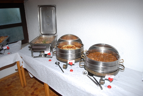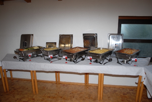 Um 10 nach sieben, hab ich dann jemand mit einem I-Phone gesucht, damit ich mir die Nummer von Catering-Service rausuchen konnte. Ich hatte mir natürlich keine Notfall-Liste mit allen Telefonnummern gemacht. Bis ich die Nummer rausgesucht hatte, wurde mir gesagt, dass der Caterer da ist. Er prompt alles schnell aufgestellt und wir konnten das Buffet eröffnen.