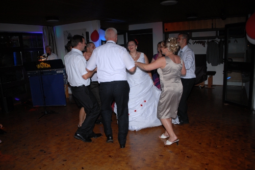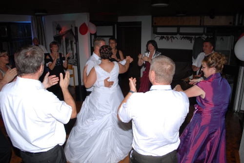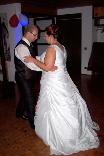 Kurz nach dem Essen wurde ich mehrfach angesprochen, wann wir denn nun endlich den Eröffnungstanz machten. Die Leute möchten tanzen. Also gut, ich Schatzi geschnappt und wir sind zum Alleinunterhalter und haben nach dem Lied gebeten, dass wir uns als Eröffnungstanz hatten von Mr. Emotion vorschlagen lassen. Wir begannen also den Walzer zu den Tönen von Elvis Presley - Are You Lonesome Tonight. Nach der Hälfte des Liedes hat der Alleinunterhalter auch die anderen Paare eingeladen, mit uns mit zu tanzen. Was ich sehr gut und schön fand.