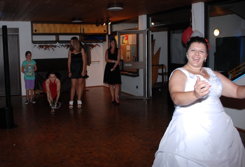 Da es jetzt schon fast 0:00Uhr war, hab ich beschlossen, dass ich nun direkt den Brautstrauß werfen. Ich habe alle Damen, die nicht verheiratet sind, gebeten sich aufzustellen. So viele waren das jetzt nicht. Aber einige haben sich hingestellt. Der Alleinunterhalter hat runter gezählt und ich habe geworfen. Meine Brautjungfer hat den mit ganzem Körpereinsatz gefangen. Beinahe wäre der Strauß ja auf dem Boden gelandet.
