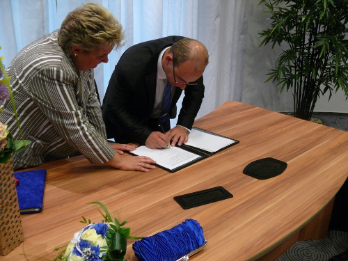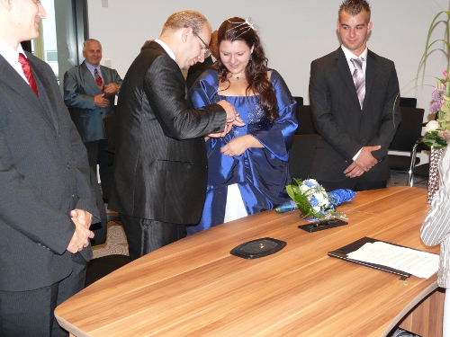 Die Eheschließung beginnt, sie hat die Rede sehr persönlich gemacht. Einige Punkte aus meinem 5-seitigen Text hat sie aufgefasst, z.B. das wir uns 2006 kennen gelernt haben und ja jetzt sozusagen in unserem 6 Jahr sind. Das wir uns in der Firma X kennen gelernt haben, die ja hier in der Gegend für so einiges bekannt ist, doch die Partnervermittlung sei ja etwas Neues... auch hatte sie erwähnt, dass ihr jemand zugeflüstert hatte, das Benny eigentlich nie heiraten wollte und dann doch zum "Beratungsgespräch" ins Standesamt mitgegangen ist. War sehr schön und lustig formuliert. Abgeschlossen hat sie alles mit einem Gedicht.
