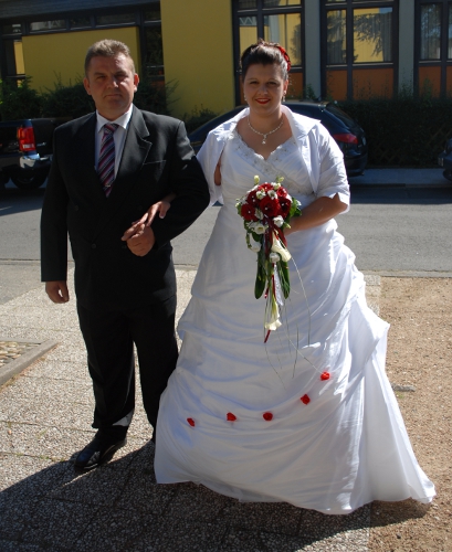 Die Brautjungfer ist reingelaufen und dem Organisten wurde das Zeichen zum Spielen gegeben und er fing an. Ich hatte dem Organisten freie Wahl beim Ein- und Auszugslieg gegeben. Er hat zum Einzug Jeremiah Clarke (1674 - 1707): "Prince of Denmark's March" gewählt. Was sehr schön war. Ich bin mit meinem Vater eingezogen. Alle meinen, wir wären zu schnell gewesen. Doch ich fand, wir sind schon sehr langsam reingegangen. Vorne stand Benny. Dort angekommen, übergab mich mein Vater ihm und wir haben vor unseren Plätzen gestanden.